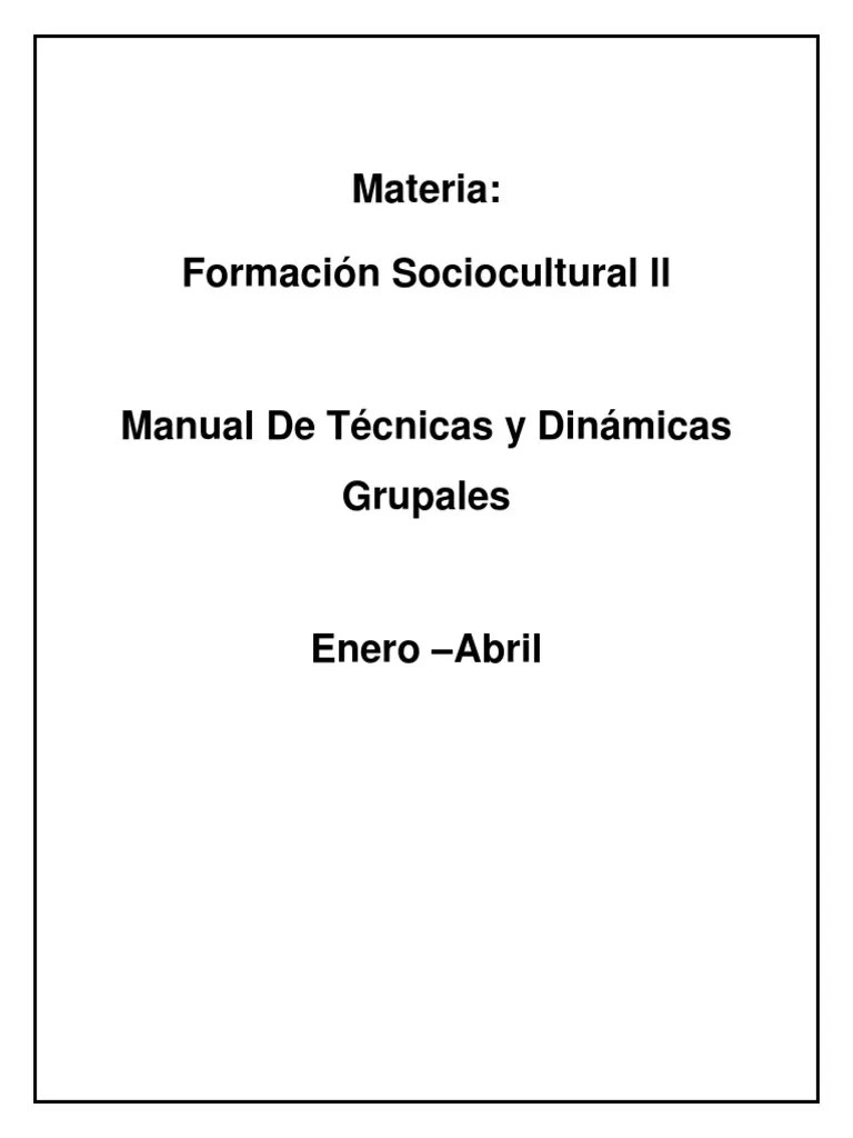 Manual De Dinamicas Grupales Pdf - Manual De Tecnicas Y Dinamicas Grupales Pdf Aprendizaje Maestros. Presente manual se integra informacin referente a los conceptos . El manual de técnicas y dinámicas grupales (2013), volumen ii, de los centros. Por el impacto que representa el trabajo grupal en las actividades preventivas, en el presente manual se integra información referente a los conceptos básicos . Representación, el dibujo, los juegos y las actividades manuales.